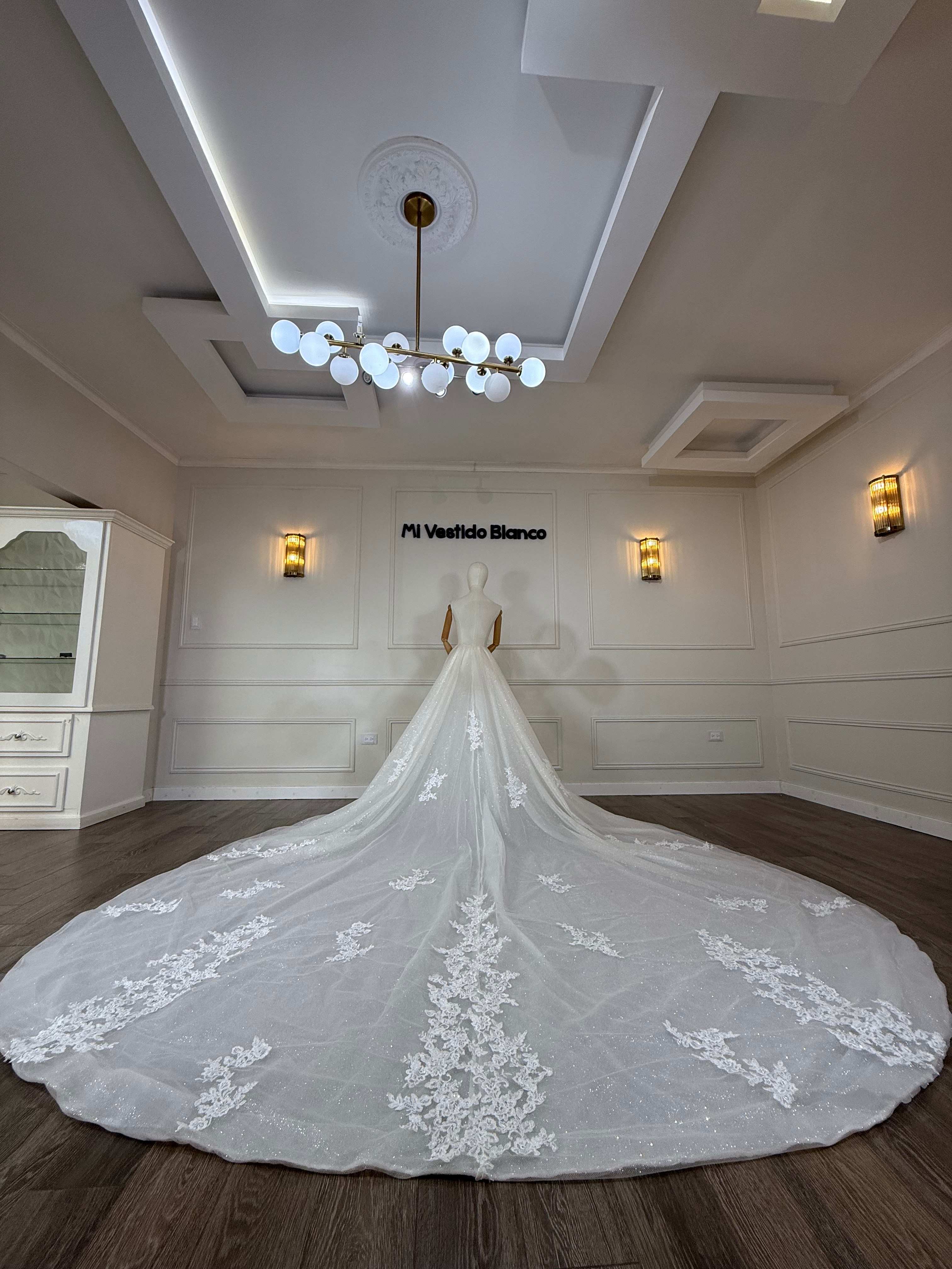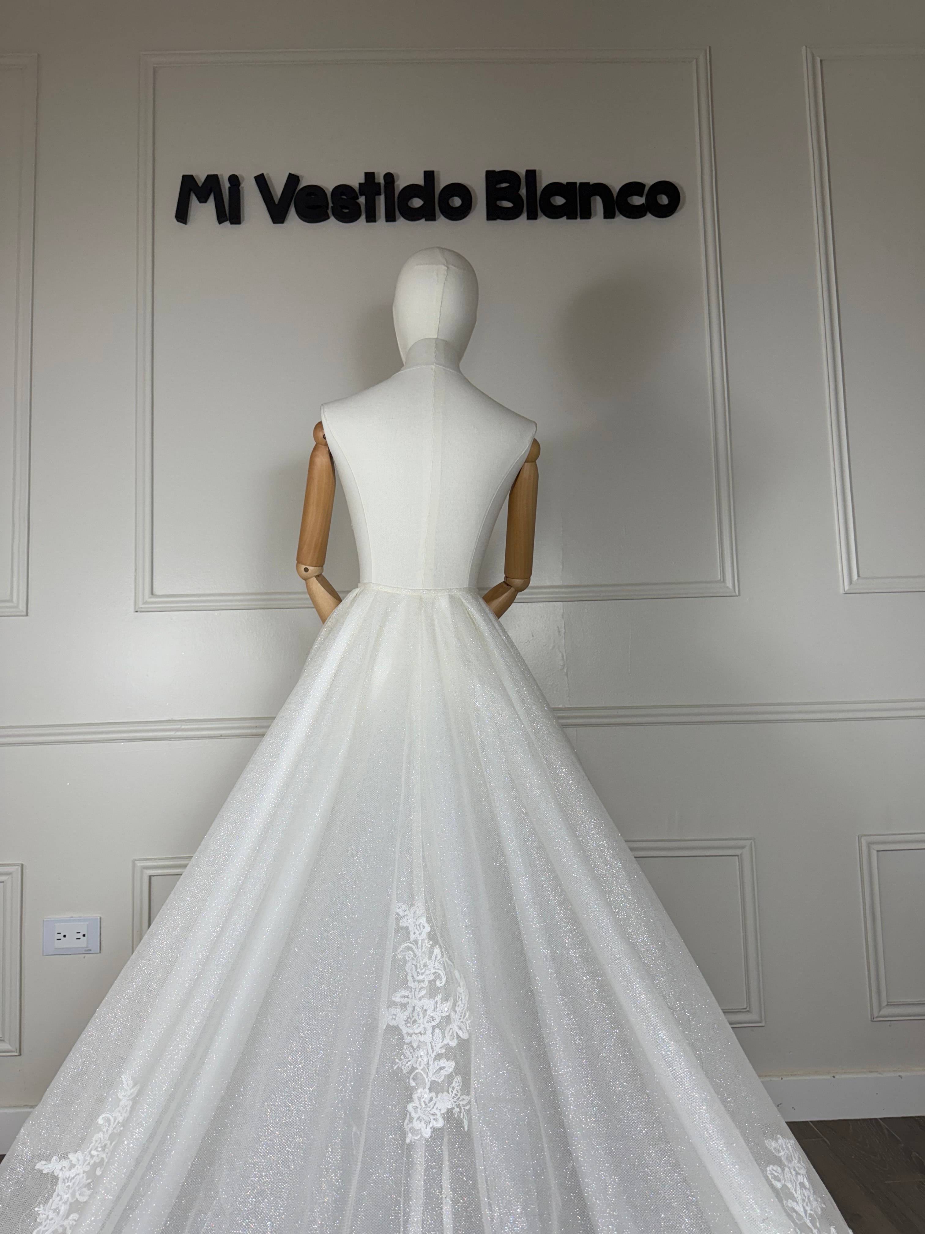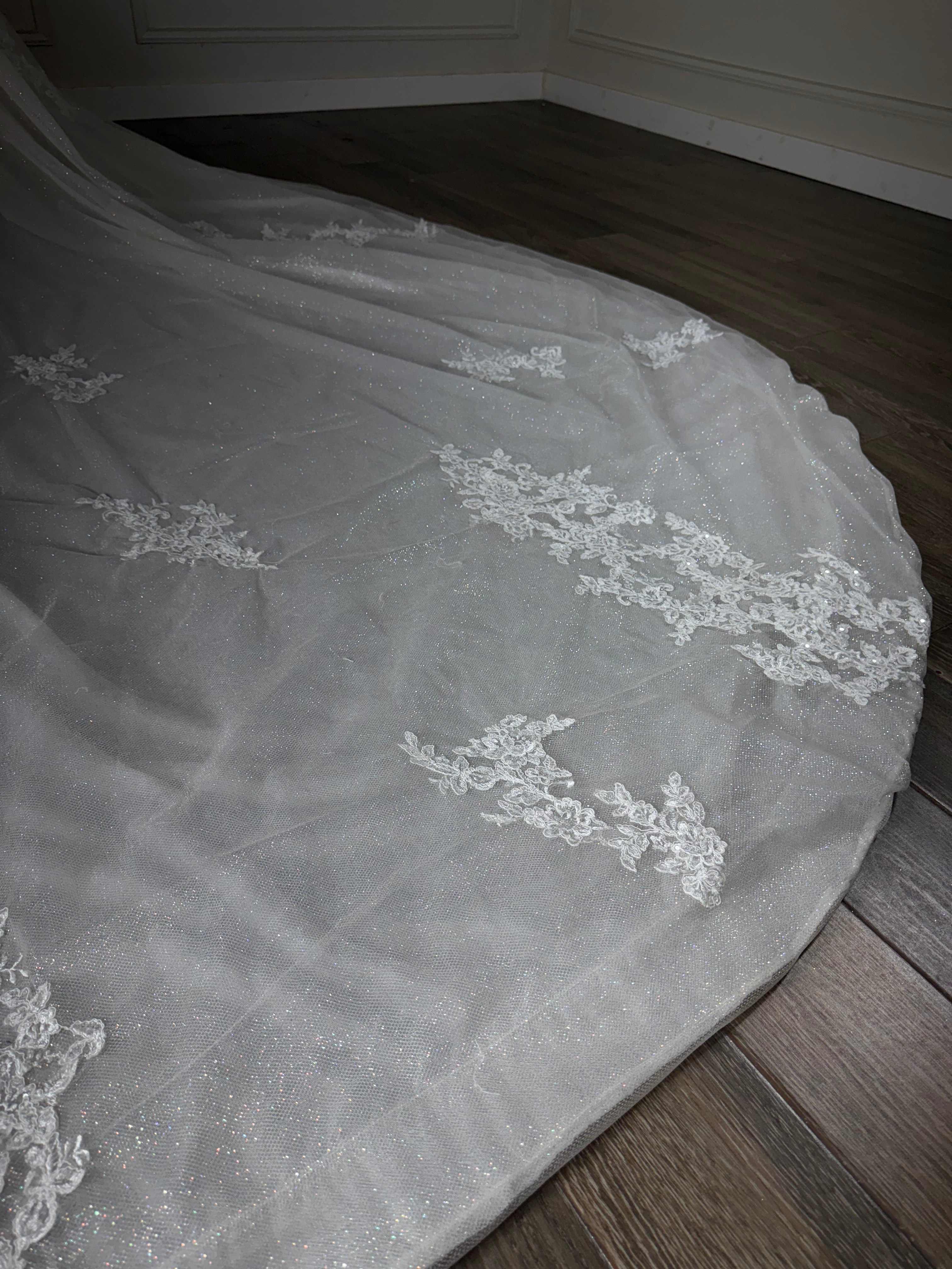 Este velo de novia con encaje y efecto glitter está diseñado para transformar cualquier look nupcial en un momento digno de cuento de hadas. Su caída amplia y fluida crea un movimiento mágico al caminar, mientras que el tul con destellos integrados aporta un brillo sutil que se ilumina con cada paso. El encaje floral bordado, distribuido estratégicamente a lo largo de la cola, añade un toque romántico y sofisticado que realza la silueta desde cualquier ángulo. Perfecto para novias que desean un estilo elegante, moderno y lleno de luz, este diseño complementa vestidos en tonos blanco o marfil y crea un impacto visual inolvidable tanto en ceremonia como en fotografía. Un accesorio imprescindible para quienes buscan un acabado etéreo y encantador en el día más especial de su vida.