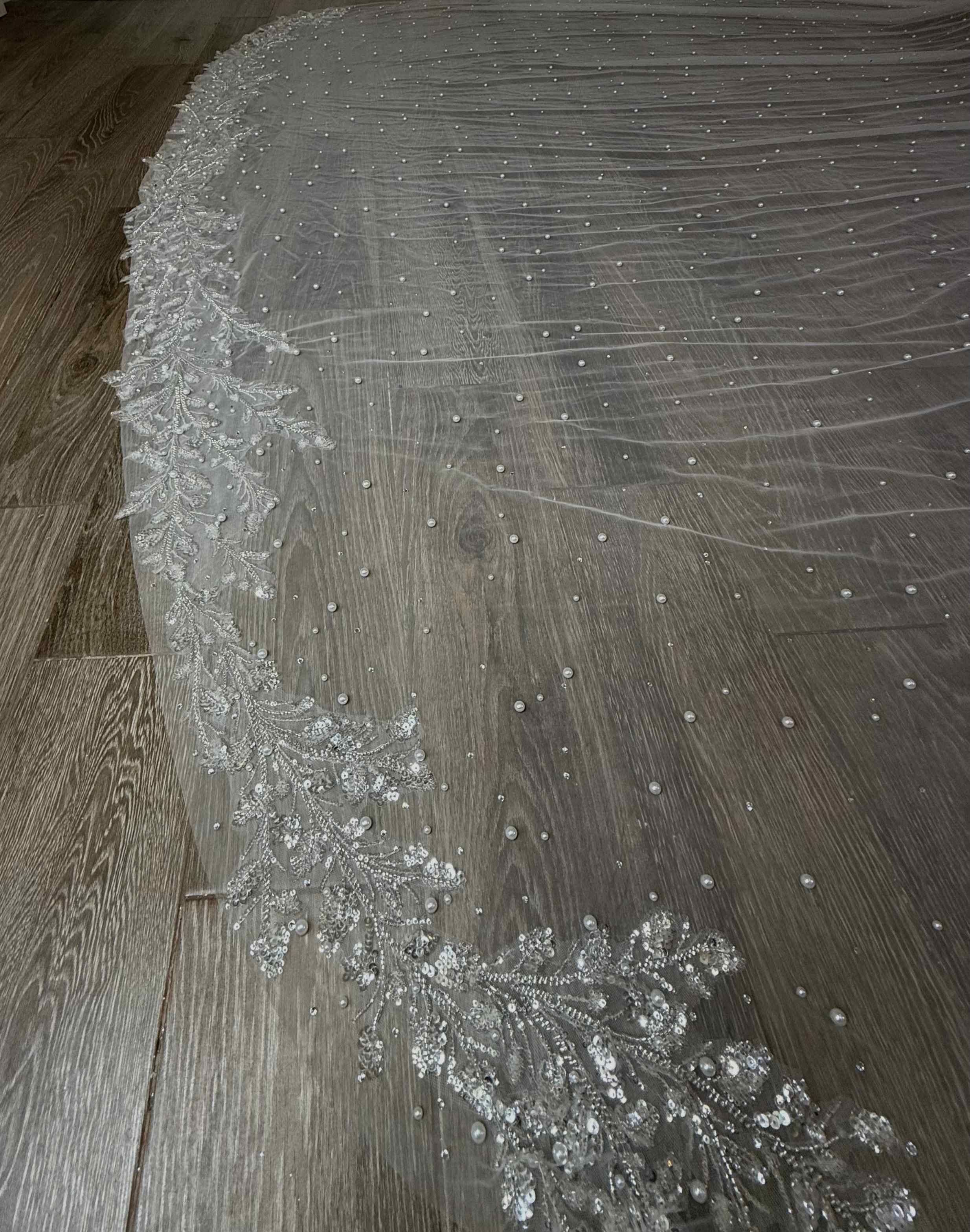 Este velo exquisitamente bordado transforma cada paso en un instante lleno de luz. Su caída amplia y etérea envuelve a la novia en un halo de brillo, mientras los detalles de encaje y pedrería iluminan la silueta con destellos que evocan pureza y sofisticación. El borde delicadamente trabajado aporta un acabado majestuoso, creando un efecto visual que deslumbra desde cualquier ángulo. Es la pieza perfecta para quienes desean un look romántico, refinado y protagonizado por una elegancia que perdura más allá del gran día.
