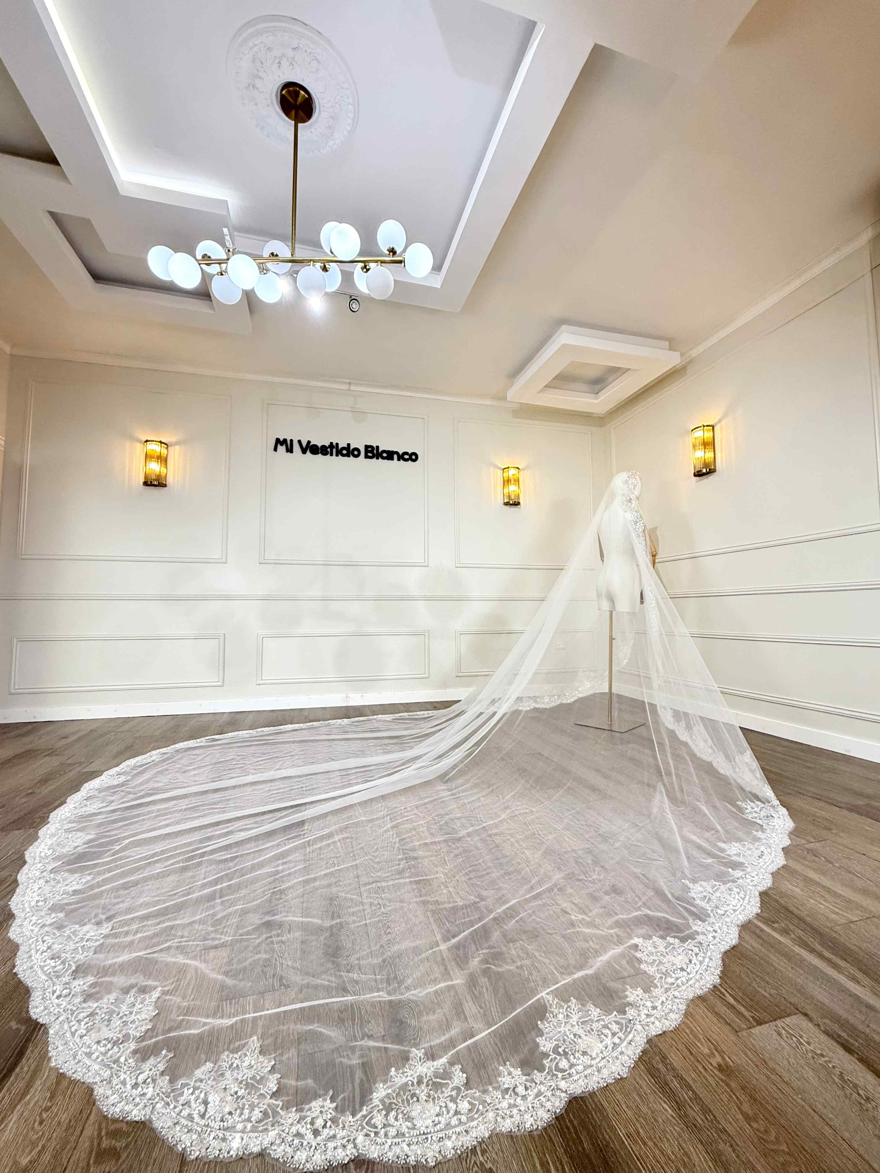 Este velo largo con bordado y pedrería artesanal es una pieza elegante y sofisticada que eleva cualquier look nupcial. Confeccionado en tul suave y ligero, presenta delicadas aplicaciones bordadas con lentejuela y pedrería brillante a lo largo del contorno, creando un efecto luminoso y refinado. Su caída natural enmarca el rostro y los hombros con sutileza, aportando un acabado romántico y de alta costura al vestido de novia.