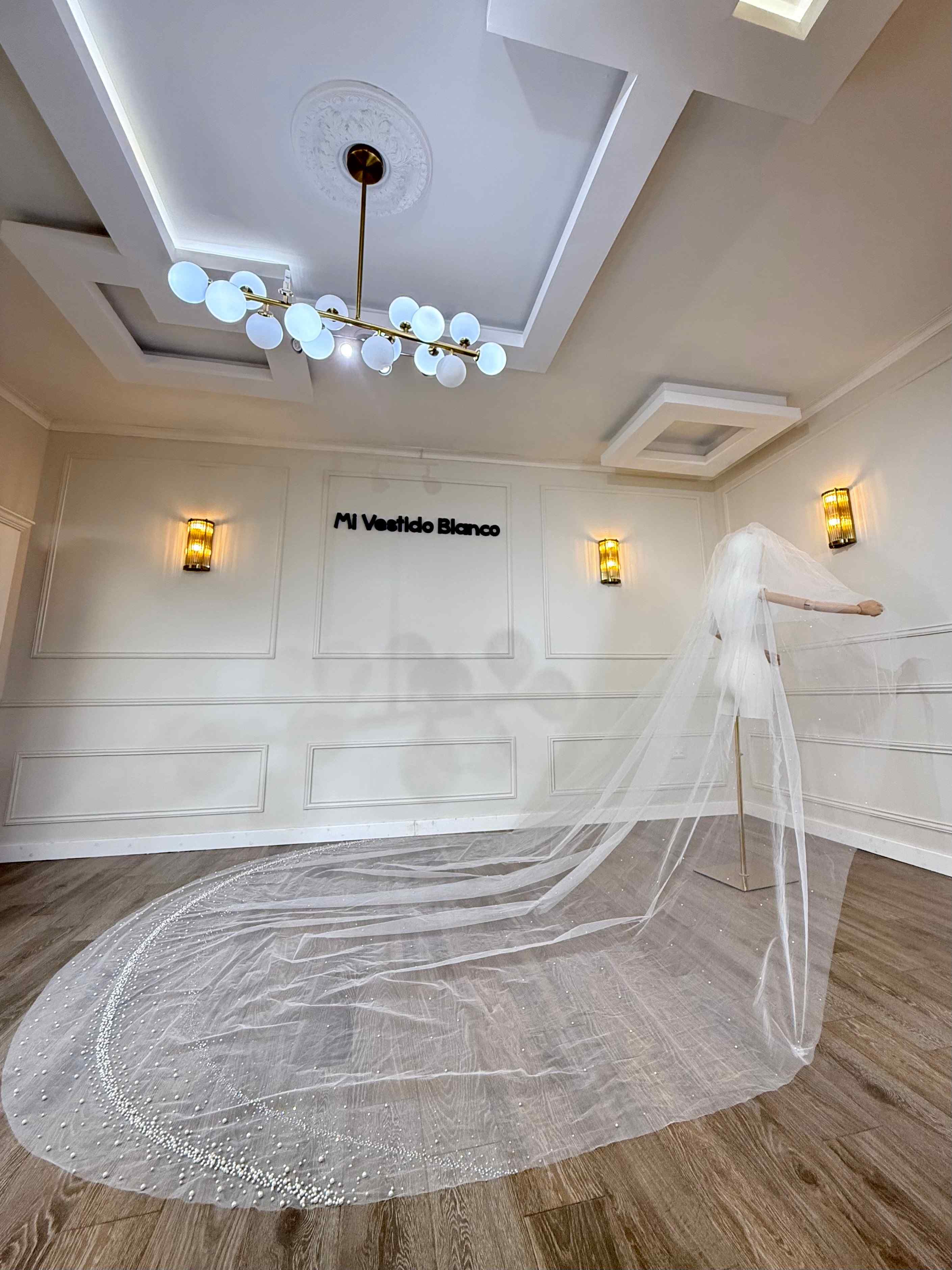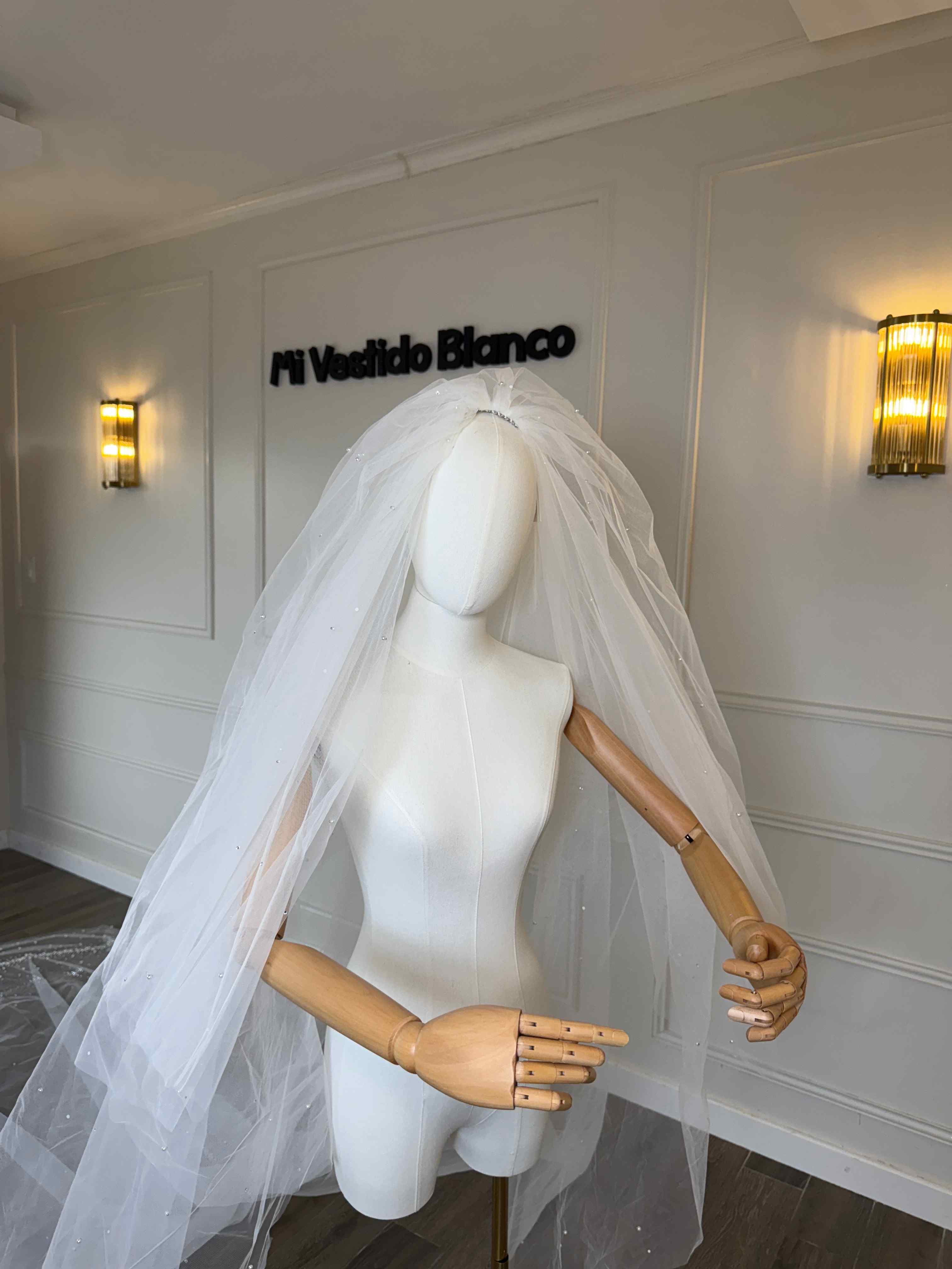 Este velo de tul suave con delicados destellos incorpora un brillo sutil que acompaña cada movimiento, creando una atmósfera luminosa y etérea alrededor de la novia. Sus aplicaciones distribuidas de forma armoniosa aportan un toque moderno sin perder la esencia clásica, logrando un equilibrio perfecto entre elegancia y suavidad. Ideal para quienes desean un look radiante y romántico, este diseño ilumina el rostro y realza el vestido sin opacarlo. Un complemento que transforma cualquier entrada en un momento inolvidable, rodeado de luz, encanto y feminidad.