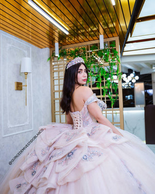 Mi Vestido Blanco - Vestido de Quinceañera Blush con Encaje Rosa y Destellos Lilas