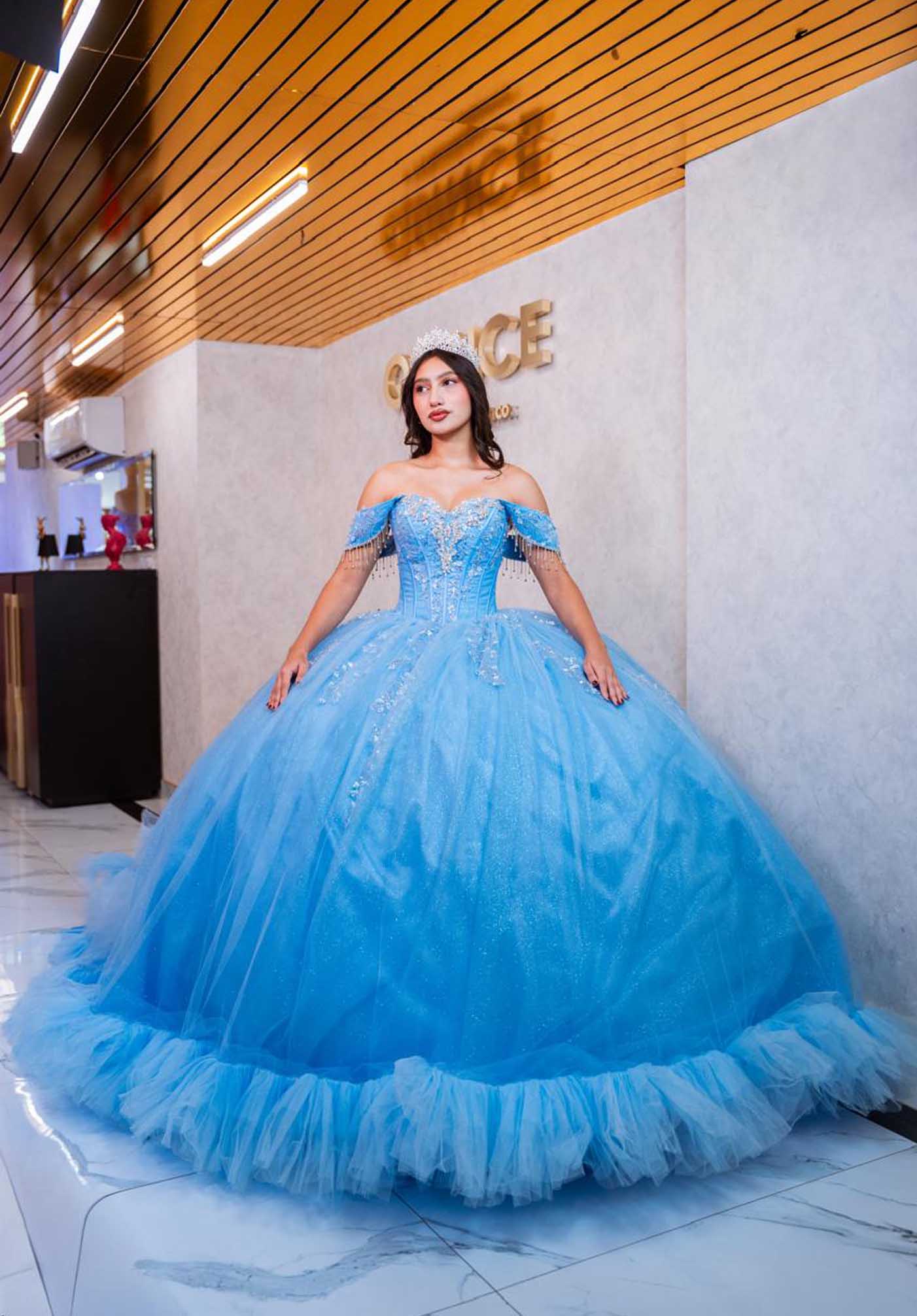 Mi Vestido Blanco - Vestido de Quince Años Azul con Falda ultra esponjada en Tul con Brillo