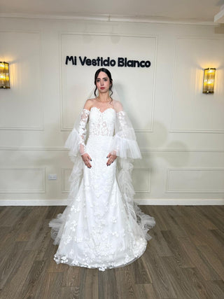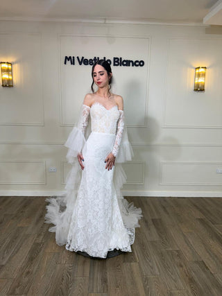 Mi Vestido Blanco - Vestido de Novia corte Sirena con Encaje Floral y Cauda Desmontable
