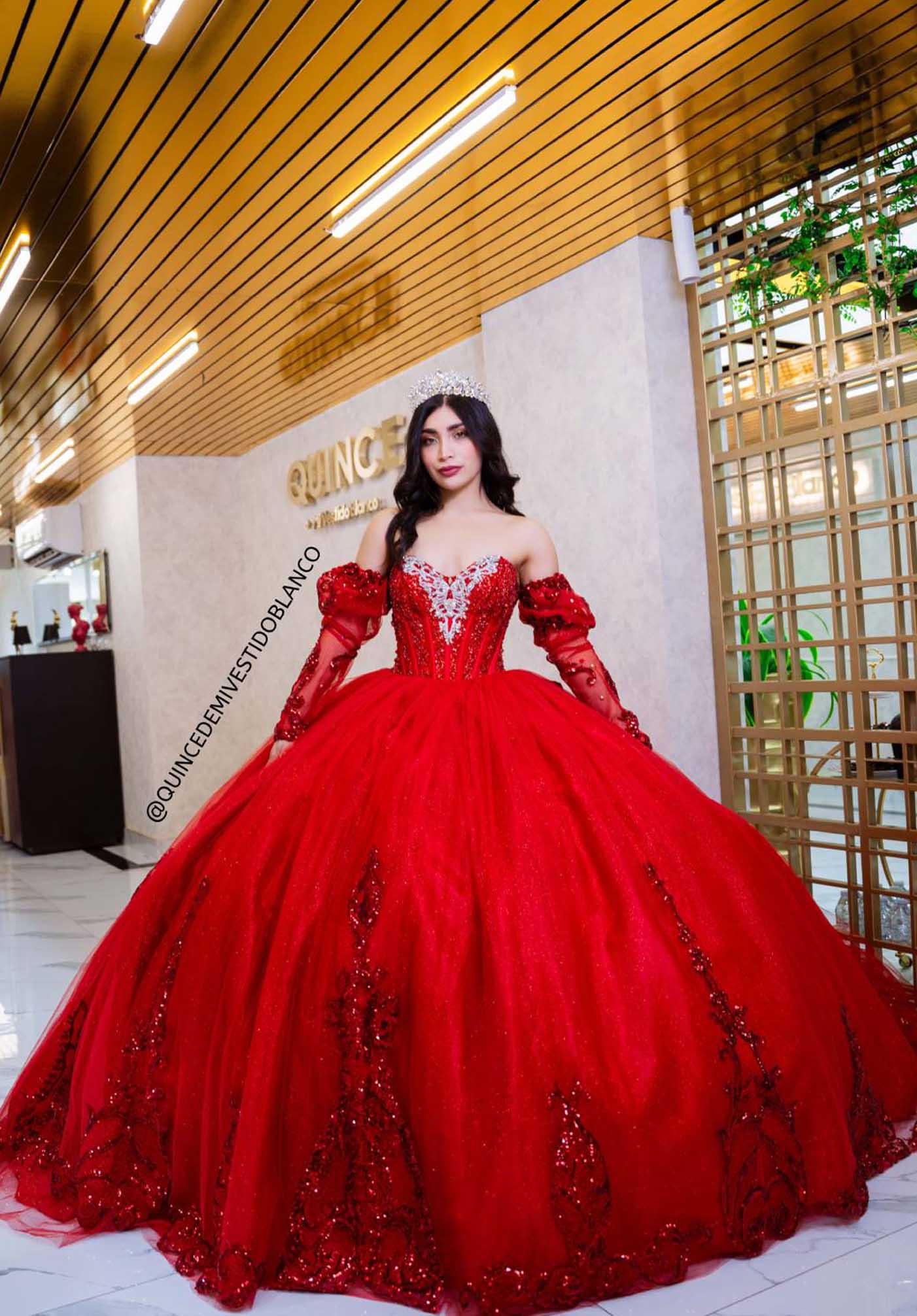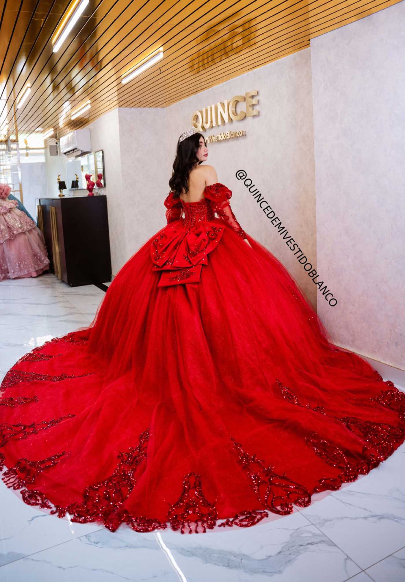 Este vestido es una propuesta elegante y espectacular diseñada para destacar en una celebración inolvidable. Su falda ultra esponjada con brillo crea una silueta princesa imponente, mientras que la terminación con aplicaciones de encaje con brillo aporta un acabado sofisticado y delicado. En la parte trasera, un elegante moño añade un toque romántico y distintivo. El corset está cuidadosamente trabajado con bordado, pedrería y encaje, complementado con mangas de encaje brilloso que aportan armonía, lujo y un diseño lleno de detalles.