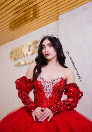 Mi Vestido Blanco - Vestido de Quinceañera Rojo con Tul, Cristales Bordados y Mangas Caídas
