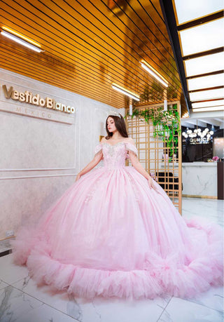Mi Vestido Blanco - Vestido de Quinceañera Rosa Pastel con Olanes y Encaje Brillante